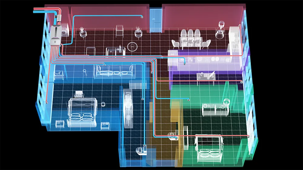 Bước 3: Bộ phân phối khí điện tử sẽ phân khối khí sạch đến từng không gian của căn nhà một cách thông minh, mỗi đầu ra của đầu khí sẽ có thêm hệ thống tạo hương thơm, có thể điều chỉnh theo sở thích của chủ nhà.